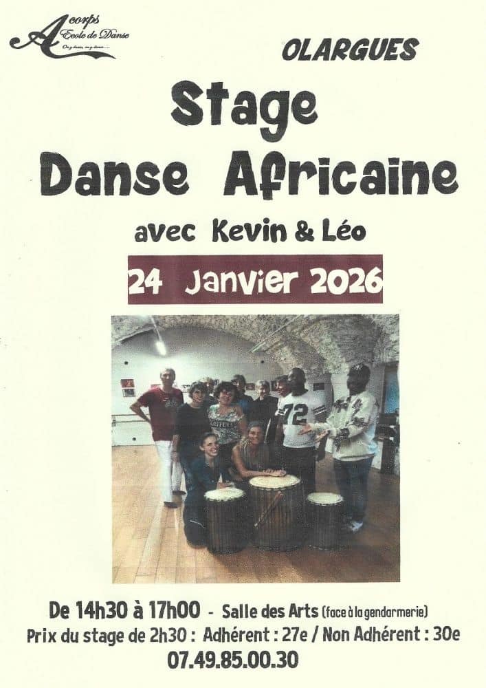 de 14h30 à 17h00, un stage de danse africaine avec Kevin et Léo plébiscités par les élèves, dans la salle des Arts, face à la gendarmerie à Olargues……